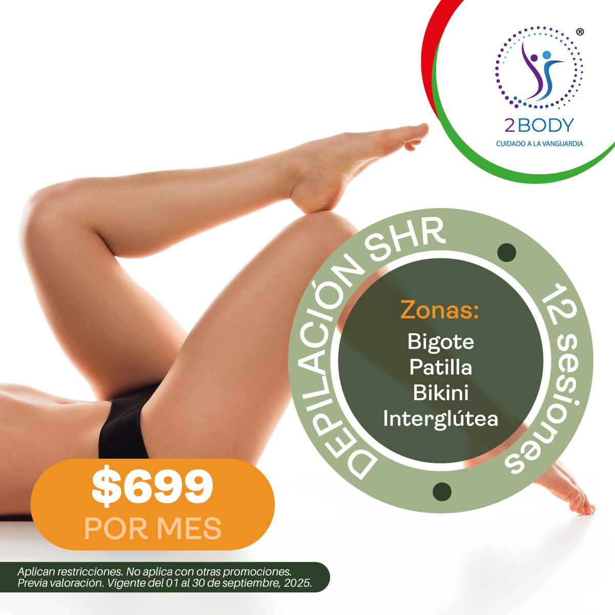 Cuerpo completo, Bikini, 1/2 Piernas, Axilas, Piernas completas, Cuello, Nuca, Patillas, Barba, Busto, Abdomen y más.